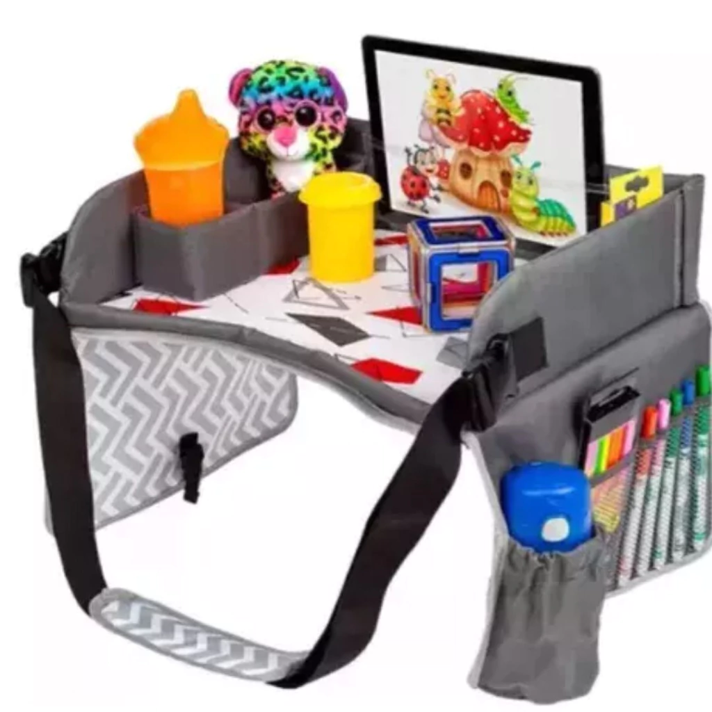 Mesa con base de madera confeccionada con tela impermeable y lavable. Posee dos bolsillos con divisiones en los laterales y una cinta con hebilla regulable. Ideal para que los chicos jueguen o pinten durante el viaje.