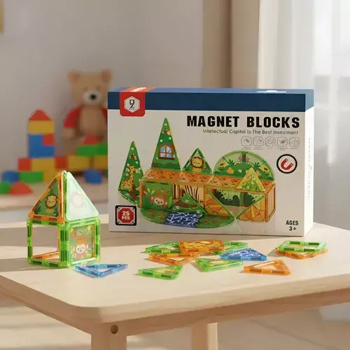 Descubrí los Bloques Magnéticos Selva - 25 piezas, el juego ideal para niños mayores de 3 años que estimula la creatividad y la paciencia. Cada bloque está estampado con imágenes vibrantes de la selva, lo que invita a los chicos a explorar y armar diferentes formas mientras se divierten.