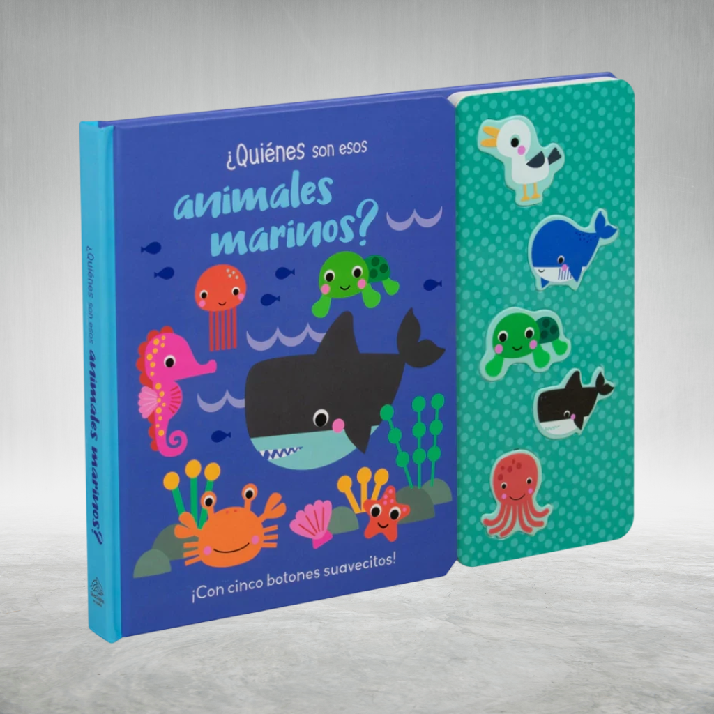 CON CINCO BOTONES SUAVECITOS!: QUIÉNES SON ESOS ANIMALES MARINOS? es un libro de sonidos diseñado especialmente para los más pequeños. Con sus cinco botones suaves, los niños pueden descubrir y aprender sobre diferentes animales marinos mientras escuchan sus sonidos característicos.