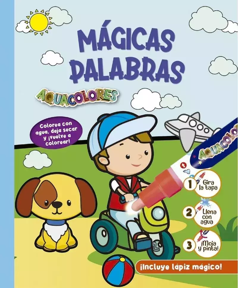 MAGICAS PALABRAS - AQUACOLORES Abre este libro y verás cómo la magia se hace realidad. ¡Los colores aparecen con el agua y desaparecen cuando se seca! Usa el marcador mágico para una experiencia increíble. Tapa de tela, con marcador mágico de agua recargable. Edad reomendada: a partir de 2 años.