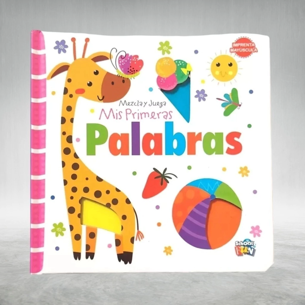 Libro de cuento en imprenta mayúscula de animales con textura y film trasparente para mezclar/combinar los colores. El modelo Mis Primeras Palabras sectoriza a los animales, las frutas, los trasportes y más. Mientras que el modelo Colores agrupa animales, comida y objetos según el color.